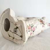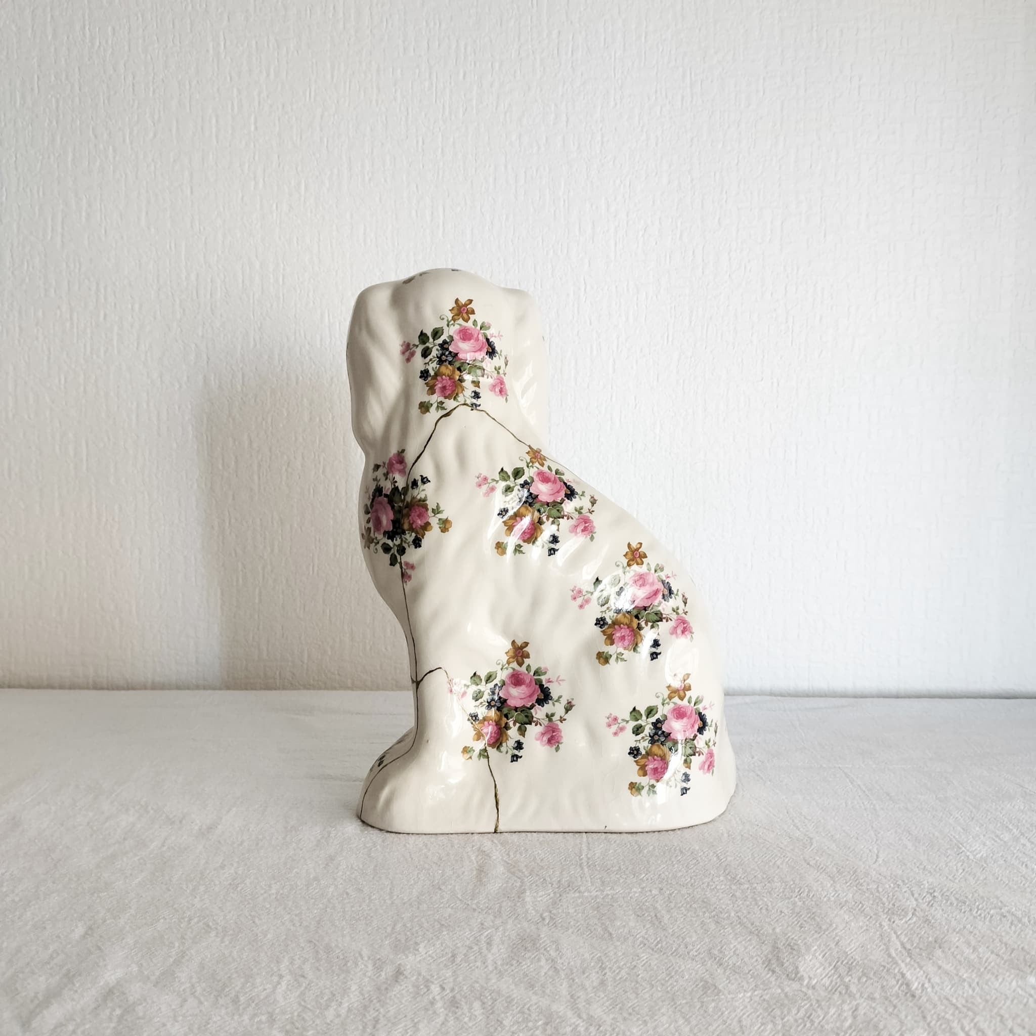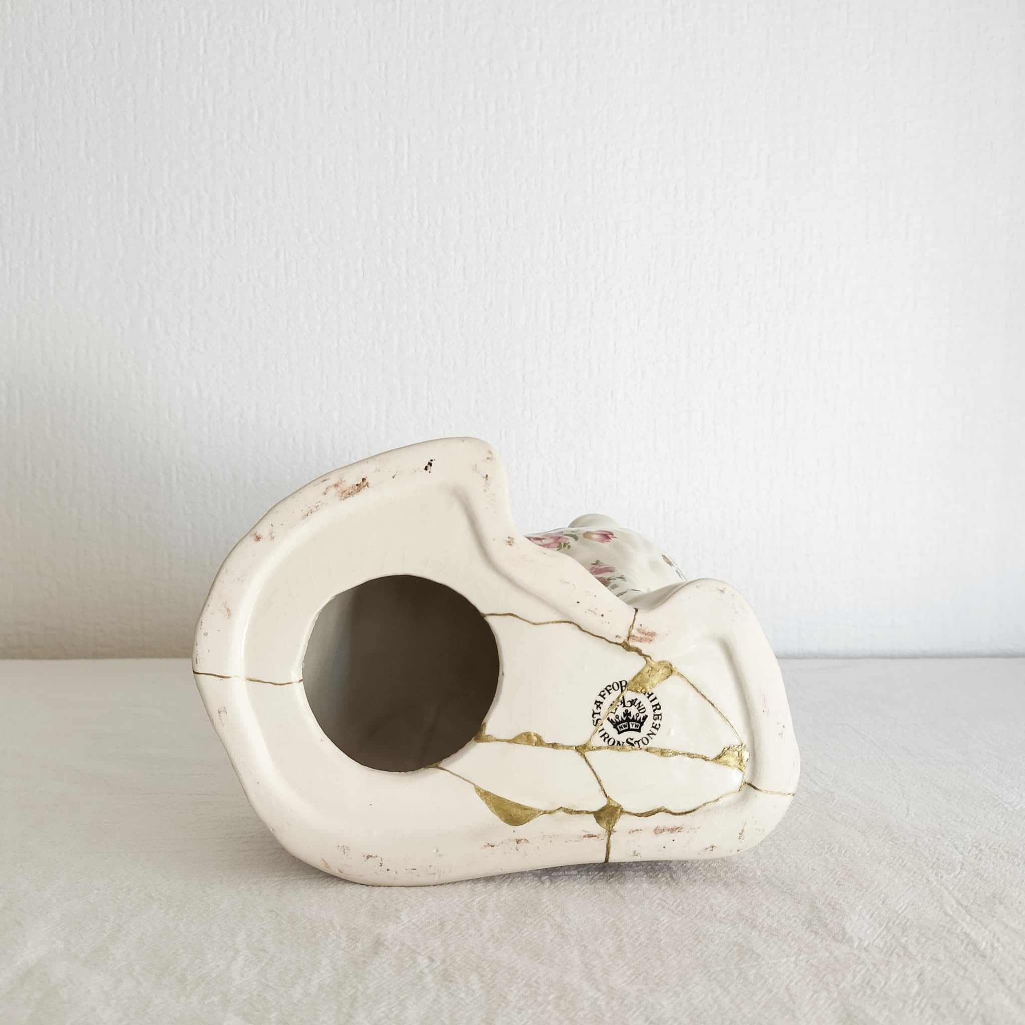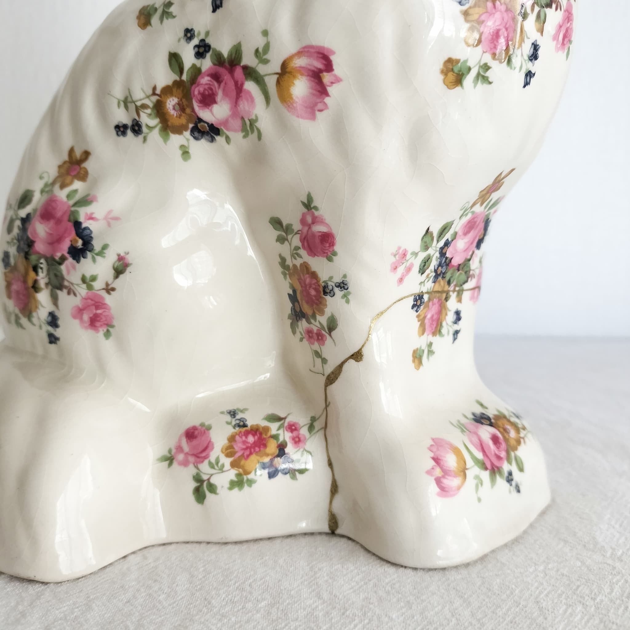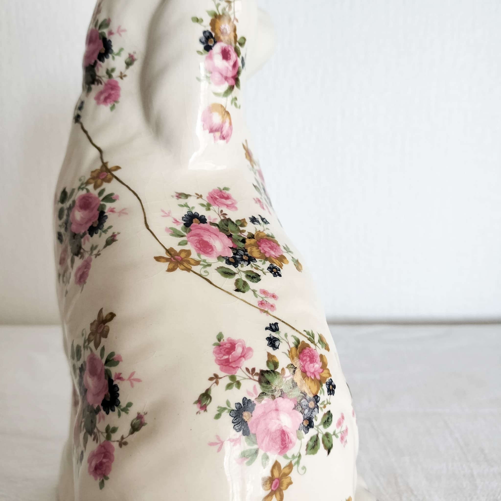 華やかな花模様に、金継ぎの輝きが美しく映えるスタッフォードシャードッグ。