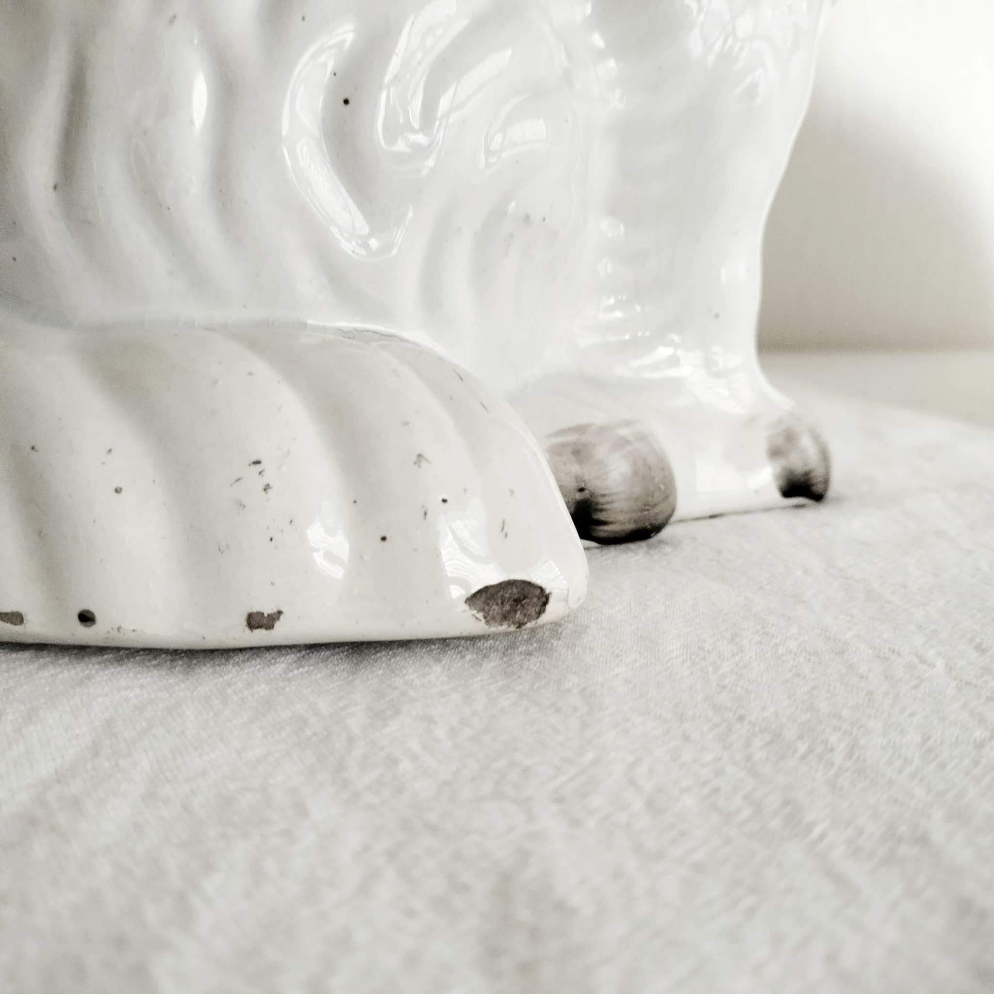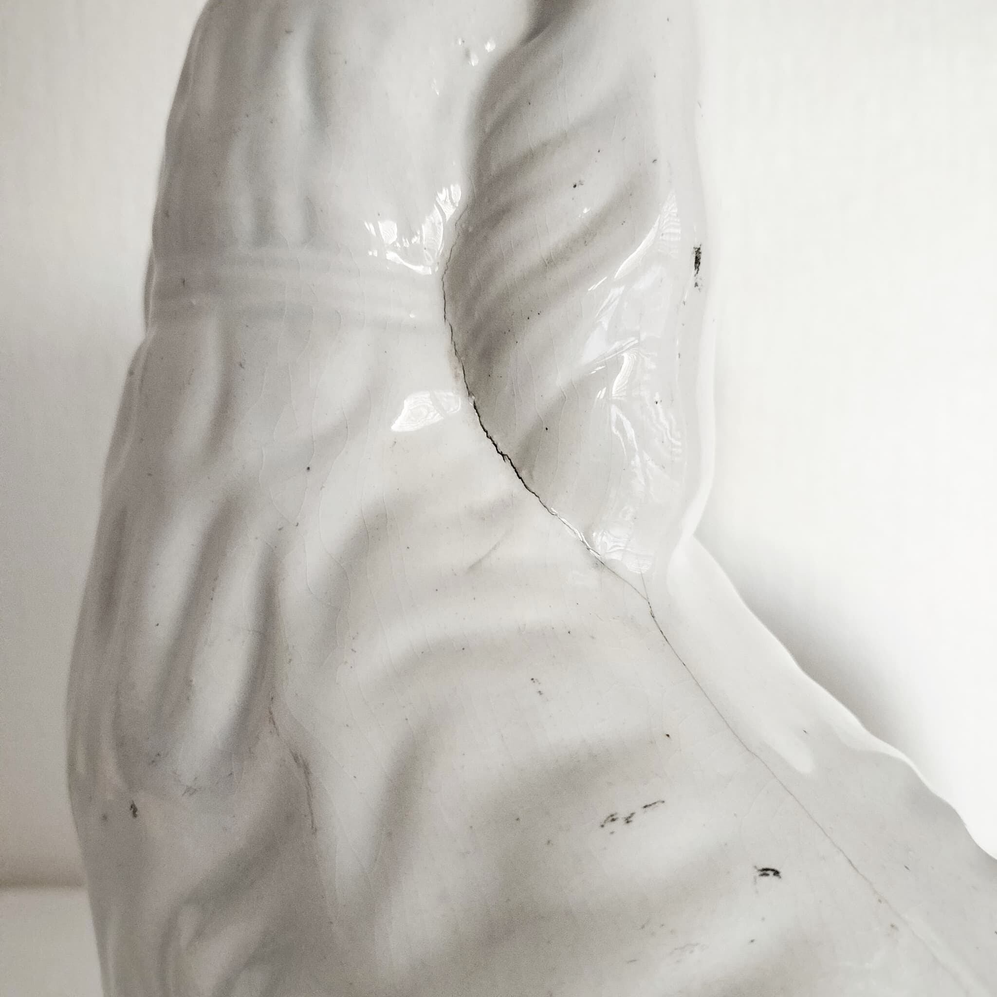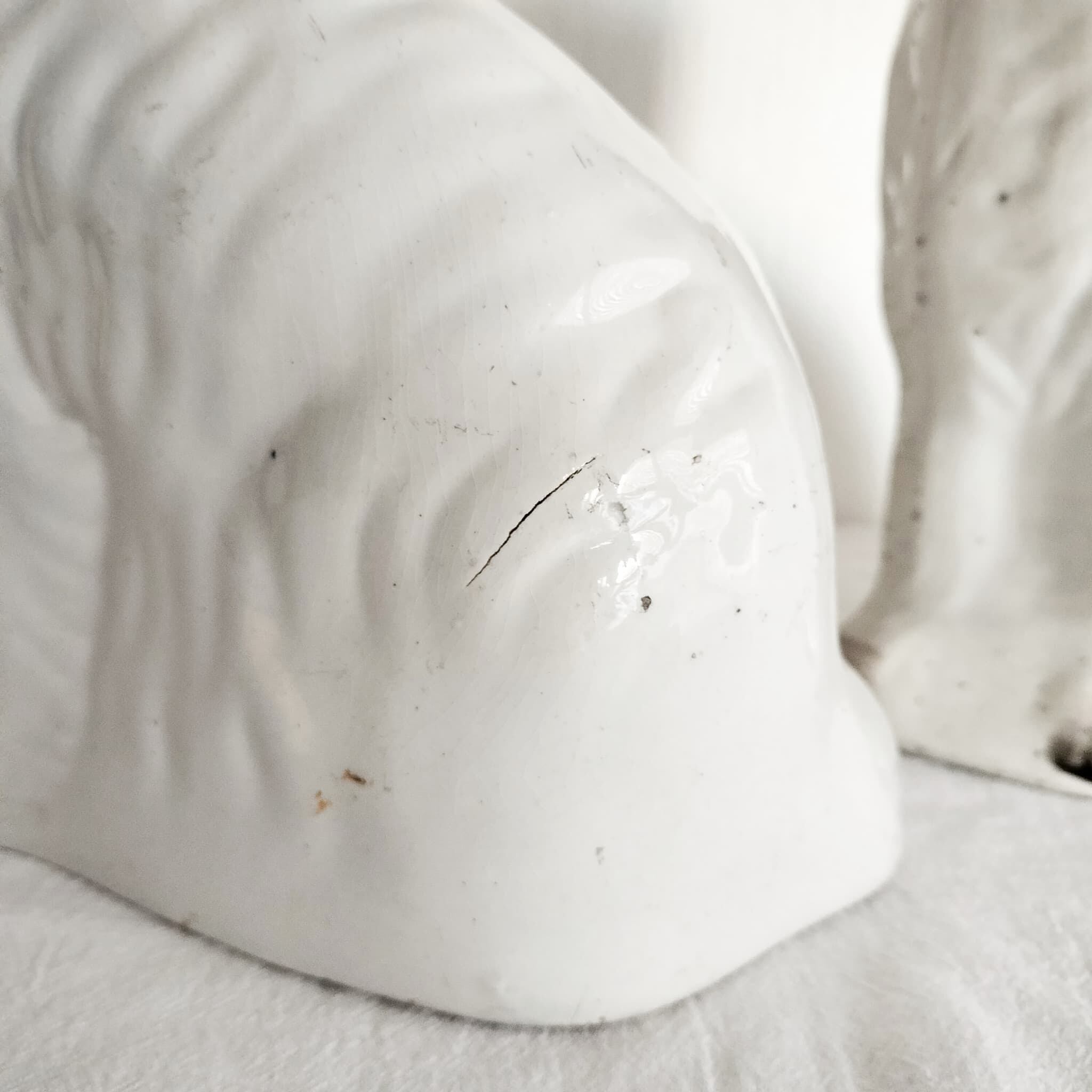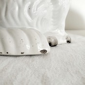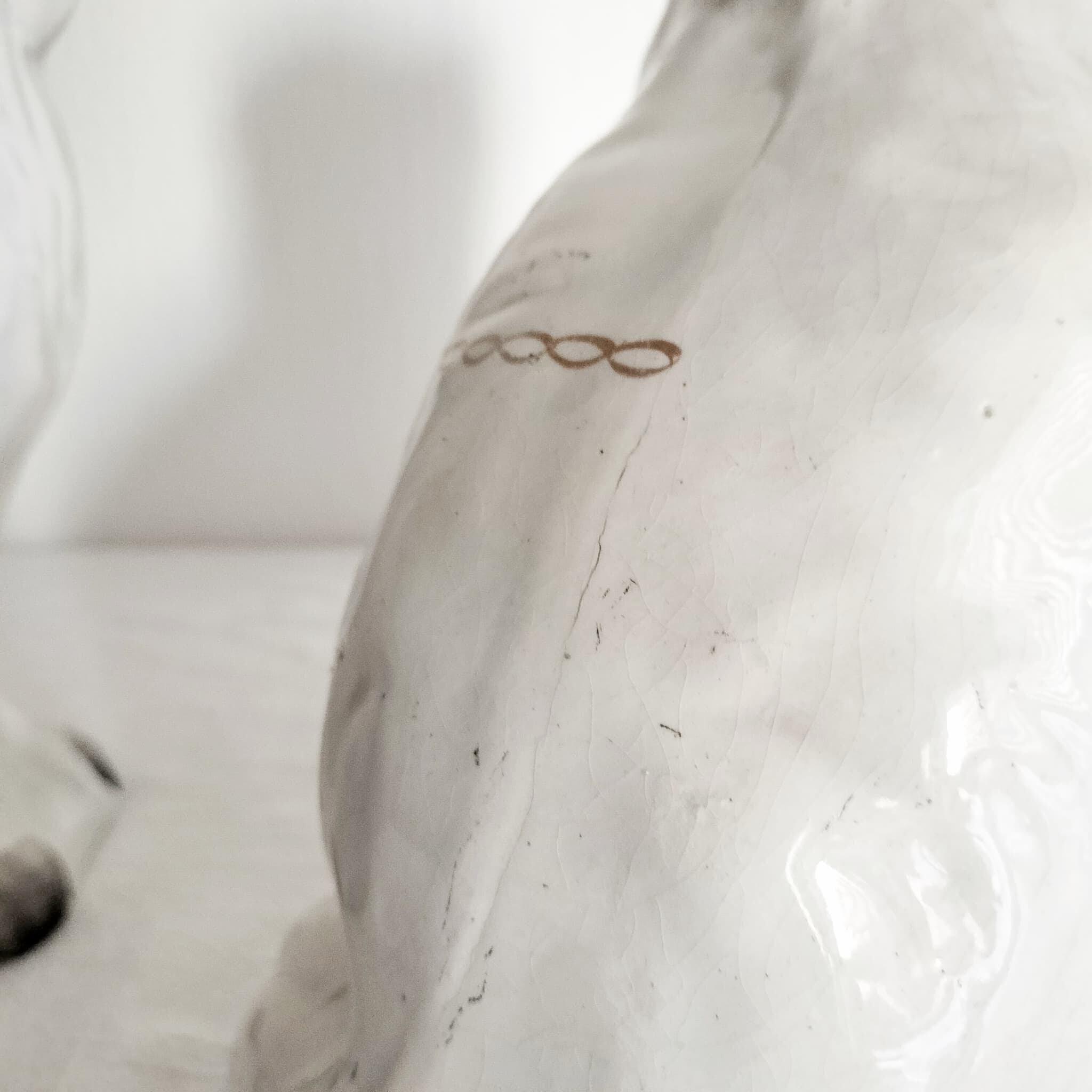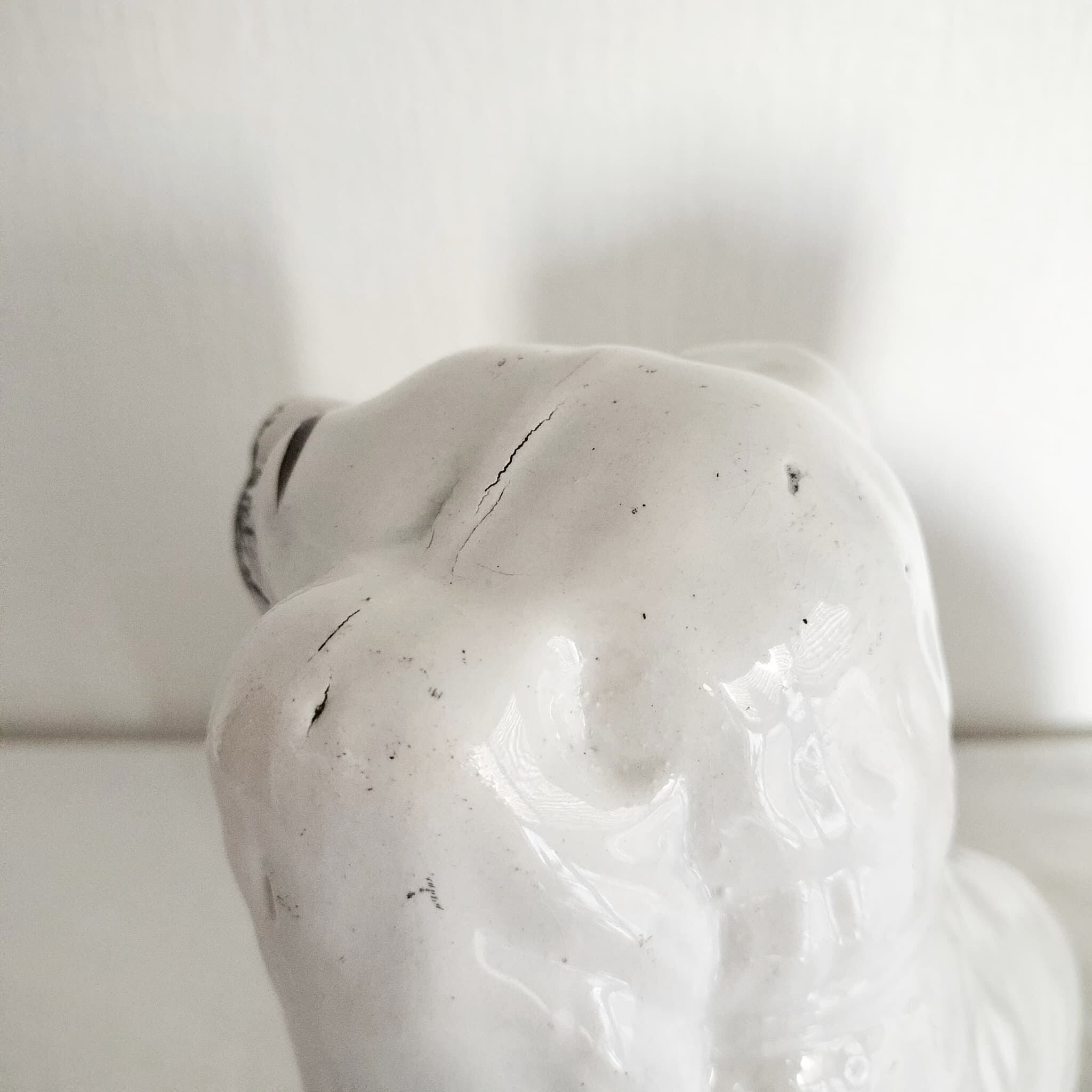 詳細:尻尾部分にいくつかの欠けが見られます。また、耳の裏から背中にかけて入っているひび割れは製造時に生じたものですが、触るとわずかに引っ掛かりが感じられます。背中にも製造時にできたと思われるキズがあります。