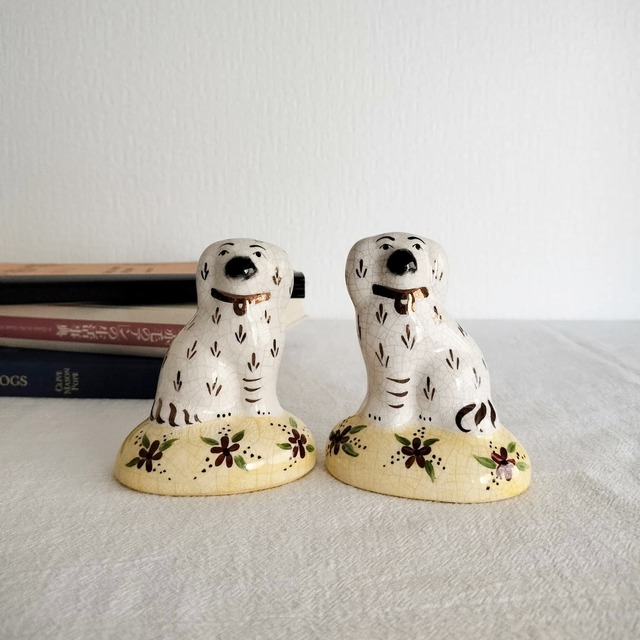 小さくても存在感しっかり! どのサイズでも大人気のブラウンペイントがminiで登場! 今回はついに……ブラウンペイントのminiペアが新入荷しました☆ ブラウンカラーはどのサイズでも人気が高く、柔らかい雰囲気と華やかさのバランスが絶妙なんです。 高さは約9.5cmと手のひらサイズ。 一般的なスタッフォードシャードッグより小ぶりで、「まずは気軽に飾ってみたい」という方にもぴったり。 小さめなのに、 ・きりっとした眉毛 ・くりんとした愛嬌のある瞳 ・丁寧に重ねられたブラウンの毛並み など、スタッフォードシャードッグらしいチャームポイントはしっかり健在。 玄関、デスク、本棚、キッチンの小さなスペースにもすっと馴染み、ふと視線を向けたときにほっと和ませてくれるペアです。 ブラウンペイントはファンも多く、“どの子にしよう?”というときに選ばれやすい万能カラー。 コレクションの一員としても、初めての一対としてもおすすめです。 すべて一点もの!気になる方はお早めにどうぞ! ■高さ:約9.5cm ■横幅:約7.5cm ■奥行:約5cm ※大きさには多少の誤差があることをご理解ください ■状態: 向かって左のコは全体的に貫入が入っています。 左足の部分に小さな欠けがみられます。 底部のひび割れは製造時の膨張によってできたものです。 手でなぞると引っ掛かりを感じる貫入もあります。 80年以上前のヴィンテージ品としてご理解ください。 -------------------------- ■発送:60サイズ ※当店で扱うスタッフォードシャードッグは数十年または100年以上前に製造され、当時から愛されていたアンティーク、ヴィンテージ商品です。記載できない細かな傷や汚れなどある場合がございます。ご承知の上ご購入頂きますようお願い致します。