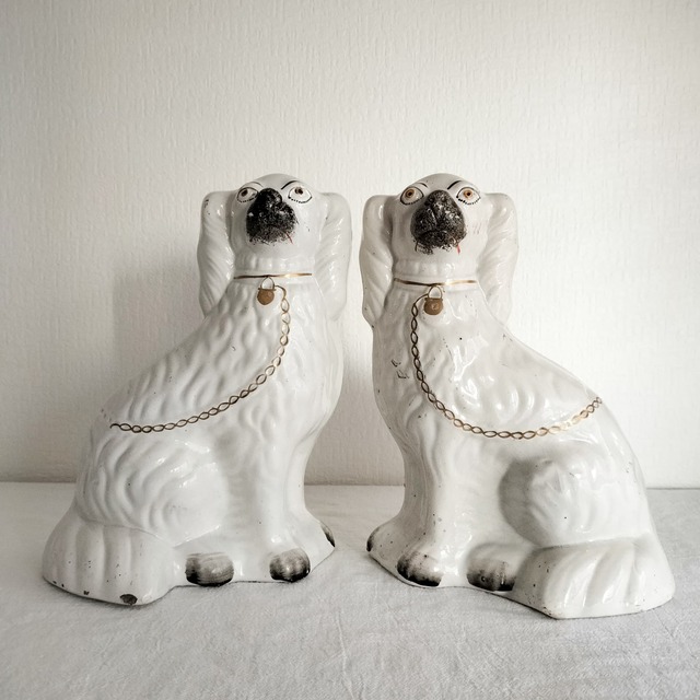 ヴィクトリア時代に誕生した、大変貴重なペアの登場です! スタッフォードシャードッグならではのどこか愛嬌のある、なんとも言えない表情。 首元には象徴的な南京錠とチェーンが丁寧に表現されています。 口元の繊細なペイントにもぜひご注目ください☆ 奥行きのある立体的な造形のため、高さ以上の存在感があり、空間にしっかりとした印象を与えてくれます。 150年以上前に誕生したアンティークのスタッフォードシャードッグ。 ぜひこの特別な機会にお迎えください✿ ■高さ:約26cm ■横幅:約20cm ■奥行:約14cm ※多少の誤差があることをご理解ください ■状態:※1/7訂正あり 訳あり価格 【左】 ・尻尾部分にいくつかの欠け ・耳の裏から背中にかけて入っているひび割れ →製造時に生じたものだが触るとわずかに引っ掛かりあり ・背中に製造時にできたと思われるキズ 【右】 ・向かって右側のコの鼻部分に小さな欠け ・背面にいくつかの斑点が見られます。 →製造過程において釉薬の中に気泡が生じたことによるもの ・うしろ底部に欠け 手作りならではの風合いと、アンティーク品の味わいをご理解ください。 -------------------------- ■発送:100サイズ ※当店で扱うスタッフォードシャードッグは数十年または100年以上前に製造され、当時から愛されていたアンティーク、ヴィンテージ商品です。記載できない細かな傷や汚れなどある場合がございます。ご承知の上ご購入頂きますようお願い致します。